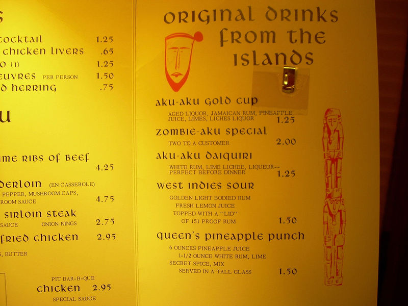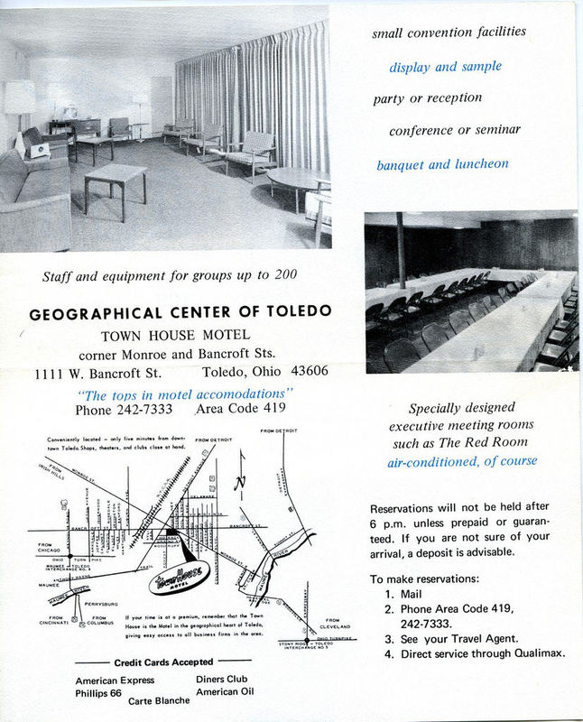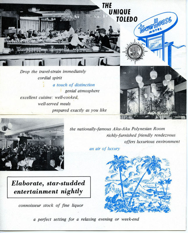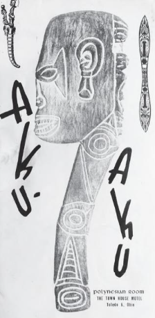 The Aku-Aku even had its own Polynesian review every night by Moana and her Islanders. It was definitely the hip place to be in the 1960s. Toledo was considered a safe haven for mobsters, and they often attended the Aku-Aku and were seated behind a curtained-off section of the dining room so as not to draw attention to themselves as they watched the show. From 1971 to 1972, the place was under new management and featured more local bands. In 1972, the Town House Motel closed after going into foreclosure, and the site was sold at a sheriff’s auction to recover debt owed to the bank. It eventually reopened as the University Inn, a truck stop hotel in 1973, before closing its doors for good in 1984. The building sat empty for five years before being demolished in 1989. A Rally’s drive-thru now occupies the site. Chester Devenow, a retired chairman of the former Sheller-Globe Corporation, said Toledo will never see a place like the Aku-Aku club again. “It was a gathering place for the top and bottom of society—the elite to the lowest characters that Toledo had to offer. It was the last important gathering place for the last generation of Toledo.” While the Aku-Aku has an impressive history and some stunning use of Tiki iconography, the room itself was streamlined and modern. This was quite the opposite of the immersive faux paradise more commonly known in the 1960s. According to Book of Tiki author Sven Kirsten, “The Aku-Aku is a great example of mid-century modern restaurants that were not expressively Polynesian in decor but lived their exoticness through their cocktails.” – from Ohio Tiki (book) by Jeff Chenault