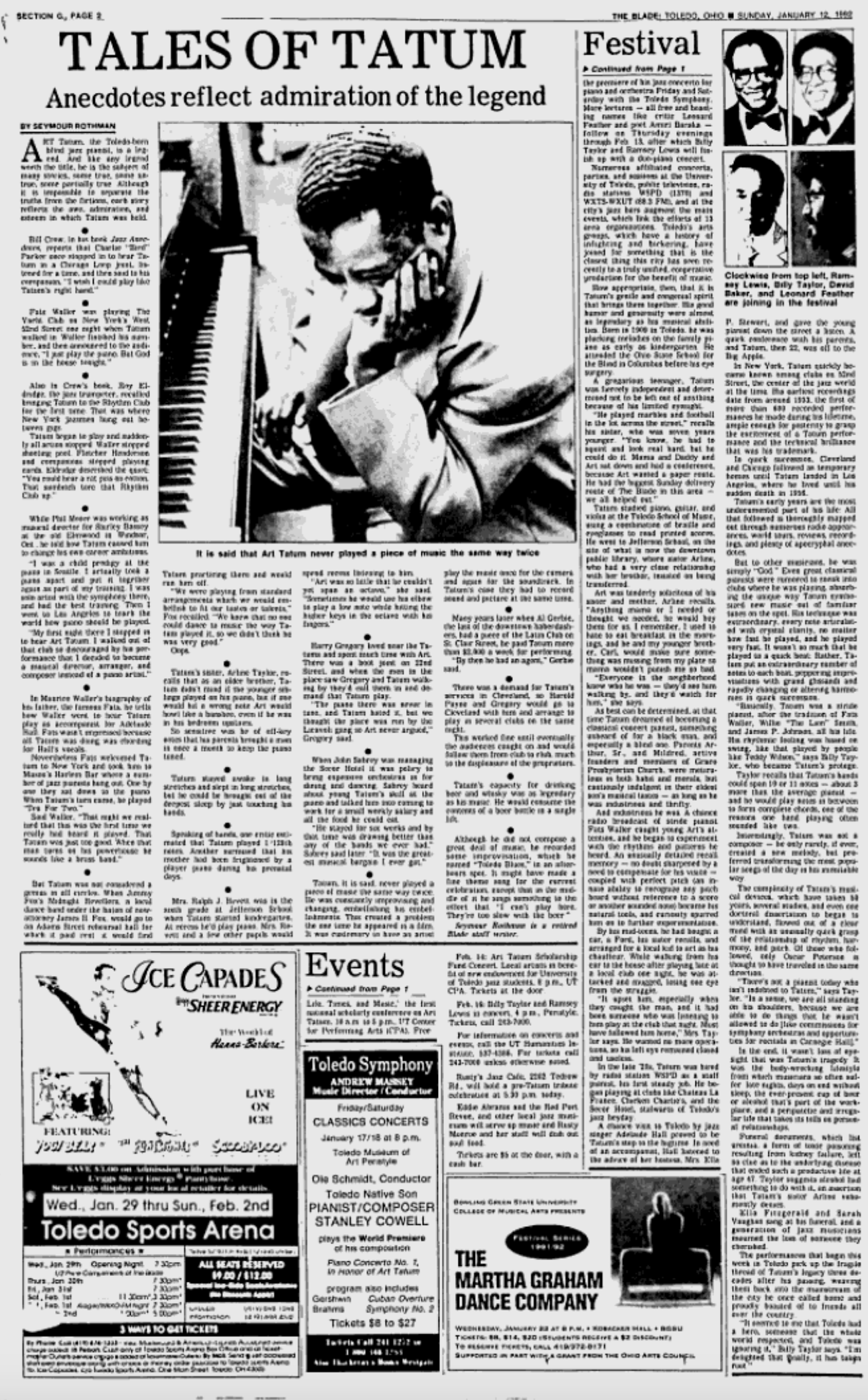 “Born in Toledo in 1920, Art Tatum was, and is, the giant of jazz piano. Count Basie called him the eighth wonder of the world. Charlie Parker once said, “I wish I could play like Tatum’s right hand!” Dave Brubeck once said, “I don’t think there’s any more chance of another Tatum turning up than another Mozart.”