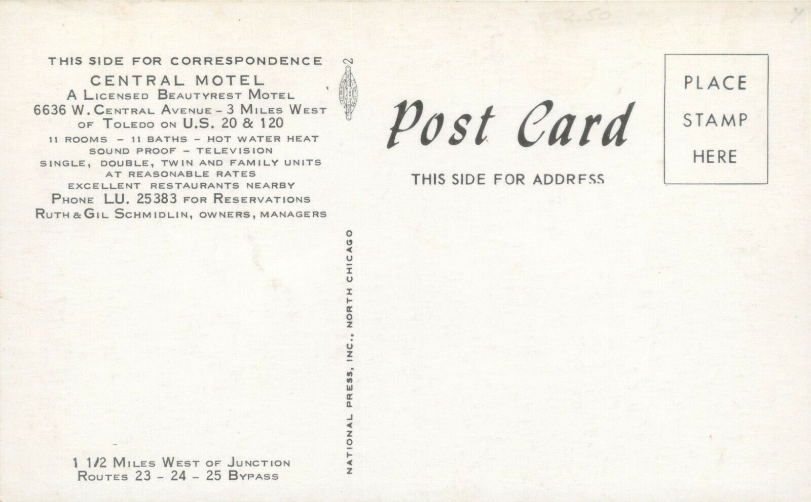 Central Motel, 6636 W. Central Ave (at Zone Ave.). Sold April 1988. Demolished. Replaced with First National Bank. Changed to Fifth Third Bank 1996. Demolished 2008. Replaced with Walgreens (demolished 2017-18). Replaced with Chick Fil-A.