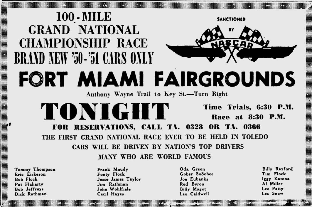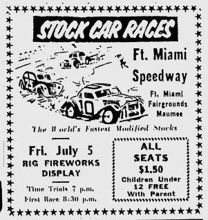 Before Toledo Speedway there was Fort Miami Speedway. A one mile dirt oval track on the Fort Miami (Lucas County) Fairgrounds in Toledo, Ohio. First used in 1902 through 1957. Replaced by Lucas County Recreation Center.