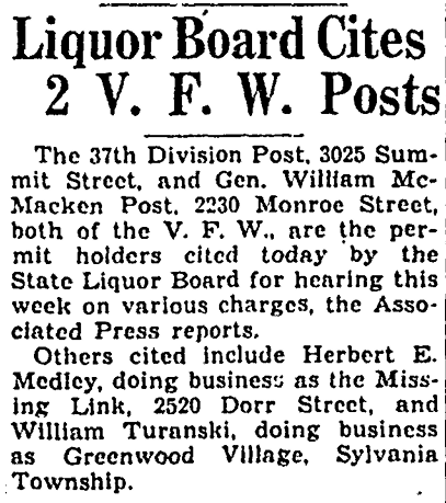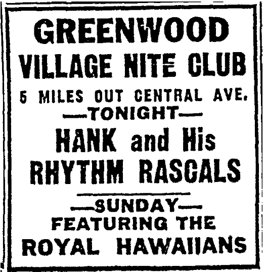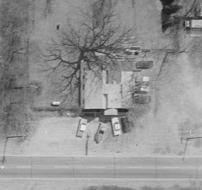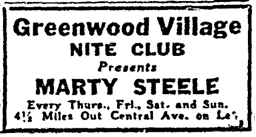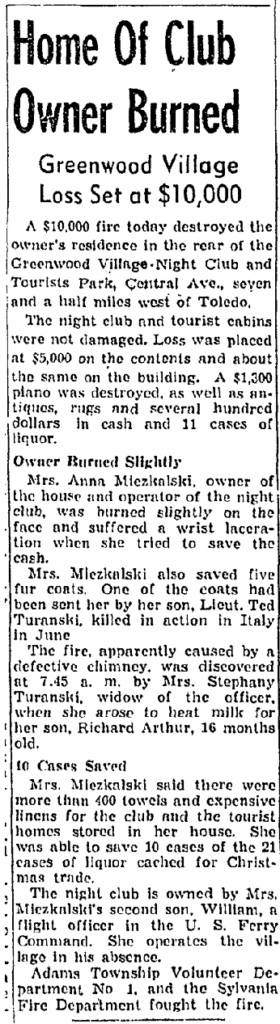 Greenwood Village Nite Club, 6335 W. Central Ave. Toledo-Lucas County Public Library Block Card Collection Demolished to make way for US 23/Central Avenue interchange in 1961/62. 1949. Location of Greenwood Village Nite Club circled in white. 3-29-1941, Toledo Blade. 1957. 5-20-1941 10-13-1941, Toledo Blade. 1-31-1942, Toledo Blade. 12-22-1944, Toledo Blade. Residence behind Greenwood Village Nite Club. 1958. Aerial shows the Greenwood Village Nite Club and the residence (and garage) behind it. 1961. Residence (bottom-left), garage (center) and outbuldings. One of the tourist cabins on the property. Tourist cabin (above) circled in white. 11-18-1958, Toledo Blade. 1958. The big oak tree casting it’s large shadow was located behind the nite club. 1960. Oak tree without leaves. Oak tree. Former location of the Greenwood Village Nite Club circled in black.