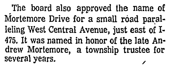 The reroute portion on the east side was officially named Mortemore Drive in 1977, named after Andrew Mortemore. The portion on the west side became part a driveway for 6350 W. Central.