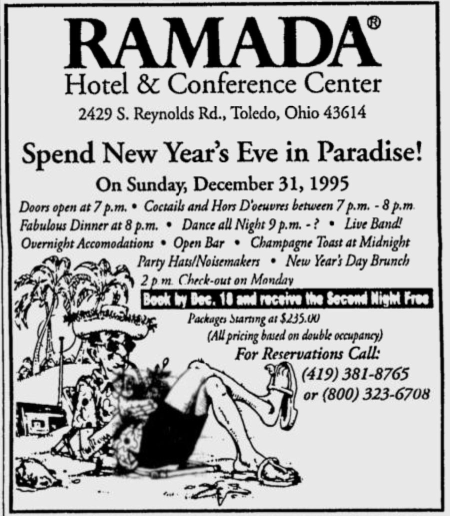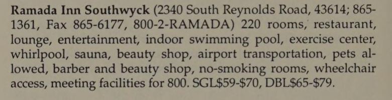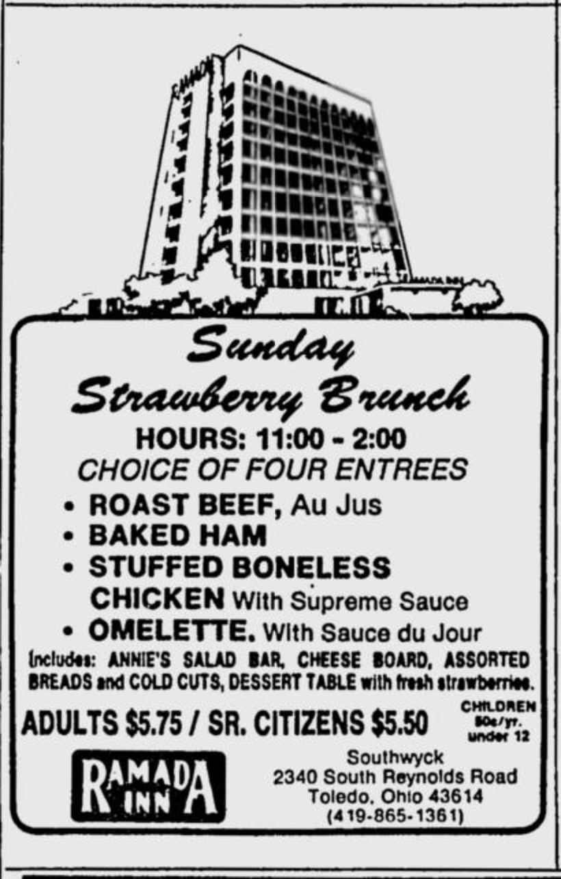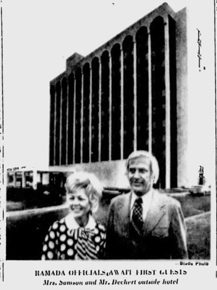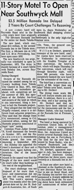 The 5.5 million dollar 11-story Ramada Inn at 2340 S. Reynolds Road opened its doors on October 2, 1974, two years later than originally planned due to court battles brought on by the Holiday Inn across the street. It was built during a commercial development boom spawned by the opening of the Southwyck Shopping Center. The Ramada Inn offered 220 rooms in the only high rise in the South Toledo-Maumee area. In its best days it was a “vanguard of activity.”