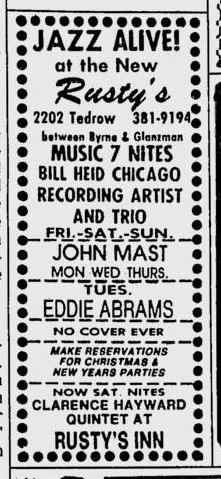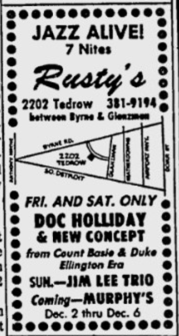 Rusty’s Jazz Cafe, 2202 Tedrow Drive (designated Jazz Avenue in 1997). Margaret “Rusty” Monroe opened Rusty’s in 1963 at 3310 Secord Road, then relocated the club to 2202 Tedrow Drive in 1979. Rusty’s Jazz Cafe was sold in 2001. Rusty passed away in 2008.