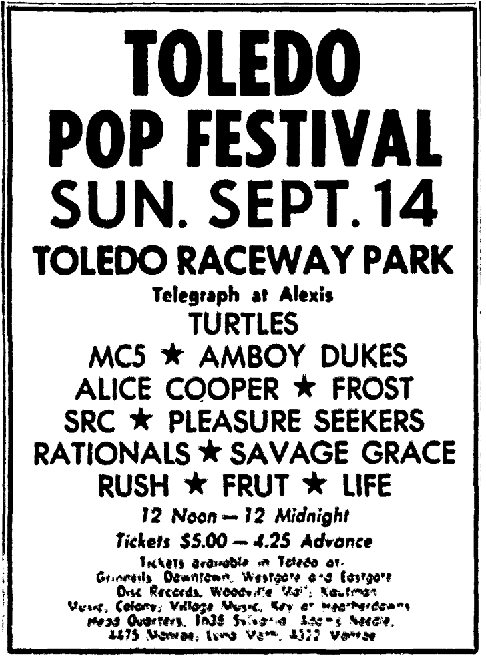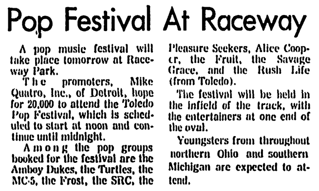 Toledo Pop Festival – September 14, 1969 – Toledo Raceway Park. Note: Not Rush band from Canada. Rush band from Toledo. 9-12-1969. Toledo Blade. 9-13-1969. Toledo Blade. 9-15-1969. Toledo Blade. 9-21-1969. Toledo Blade. 1967 aerial of Raceway Park. ODOT